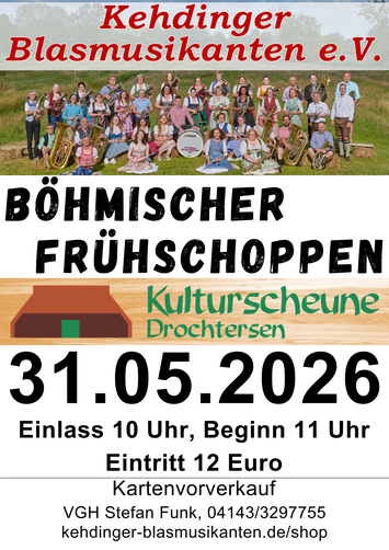 Die Kehdinger Blasmusikanten laden zum traditionellen Frühschoppen ein: Böhmische Blasmusik in Lederhosen und Dirndl, deftige Schmankerl und kühle Getränke von Andrés kleiner Kneipe. Karten: 12