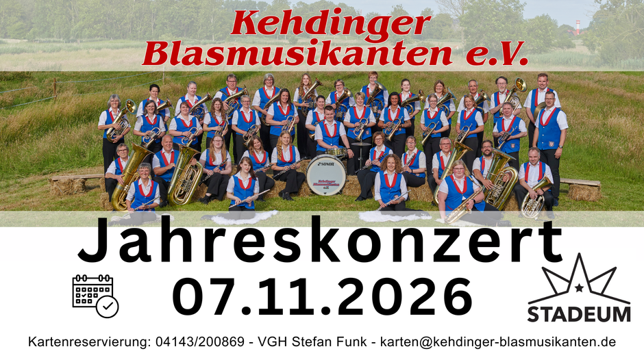 Nach dem großen Erfolg des diesjährigen Konzerts freuen sich die Kehdinger Blasmusikanten schon jetzt auf das nächste Highlight: Am Samstag, den 7. November 2026 um 19:45 Uhr heißt es im Stadeum wieder „Bühne frei!“ – mit einem neuen Motto, frischem Programm und garantiert guter Stimmung.